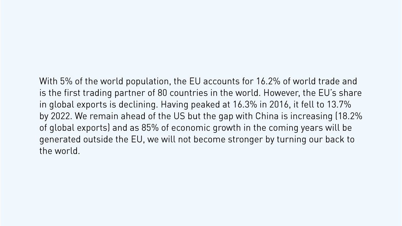 As there cannot be strategic autonomy without openness, it will need to ensure implementation of existing trade agreements, making sure they remain effective and stand the test of time. It must also finalise the agreement with Mercosur as well as other ongoing negotiations and open new ones to improve market access and investment opportunities for European companies throughout the world.